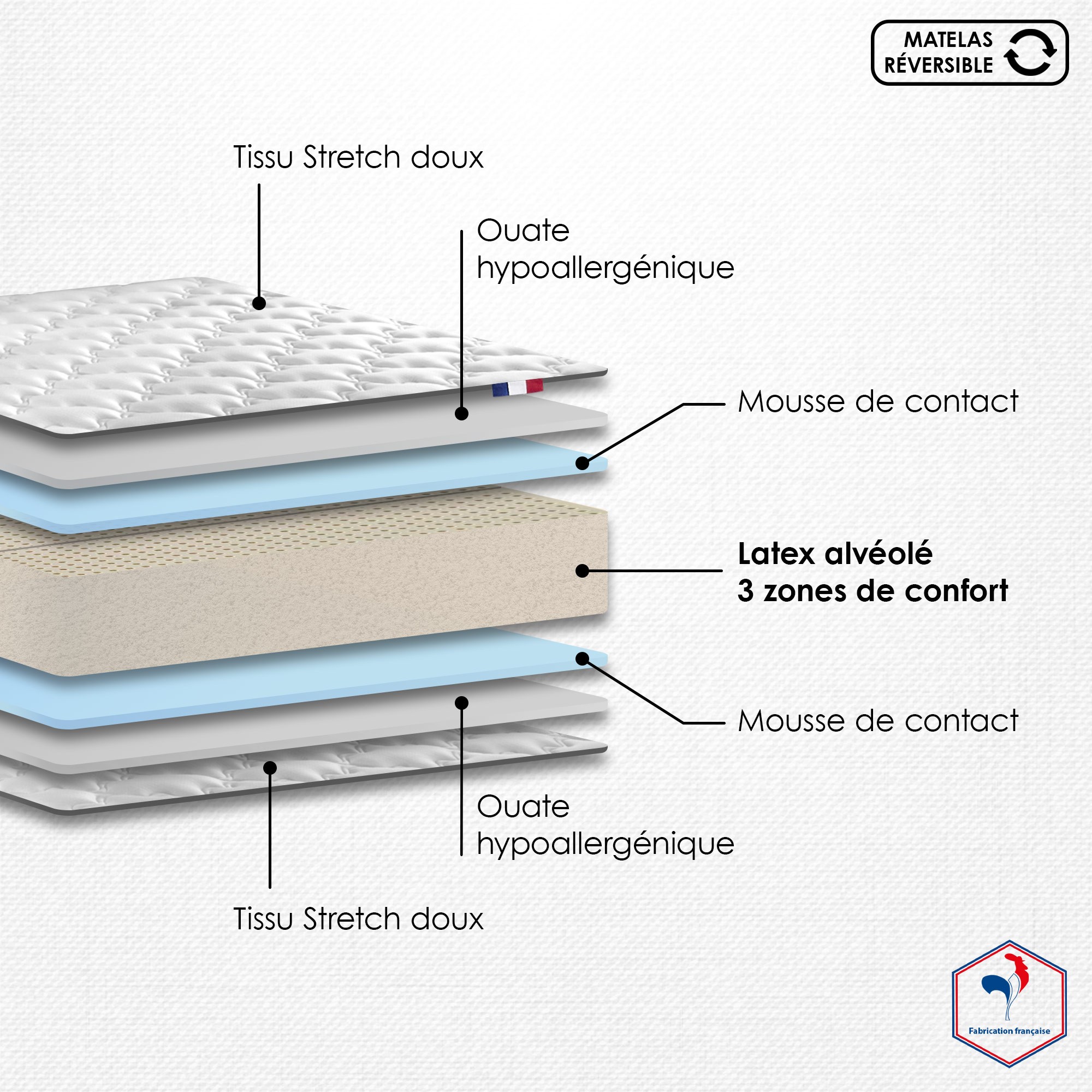 Matelas bi-confort latex et mousse HR 3 zones, soutien ferme et accueil moelleux, pour un confort équilibré toute l'année, fabriqué en France.