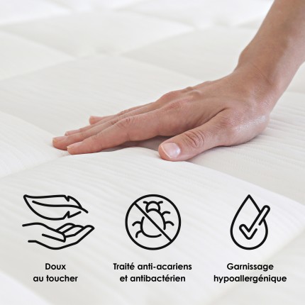 Traitement : pour une hygiène parfaite, le tissu est traité anti-acariens, antibactériens et hypoallergénique