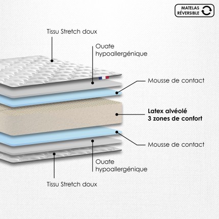 Ensemble matelas latex 3 zones et sommier : confort ferme, soutien précis et qualité française pour des nuits paisibles toute l'année.