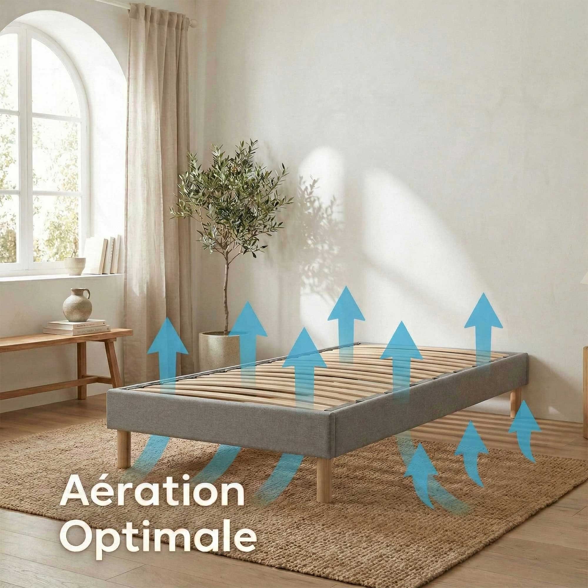 Le sommier de 15 cm de hauteur est la base indispensable de votre confort. Construit en épicéa massif, il supporte 54 lattes flexibles qui accompagnent chaque mouvement. Son revêtement gris est à la fois sobre et résistant. Facile à assembler, il se monte en seulement 15 minutes. Pour une durabilité accrue, il est livré avec 4 pieds en hêtre naturel et dispose d'un pied central renforcé dès la taille 160x200 cm. Cette structure garantit une aération parfaite du matelas pour une hygiène irréprochable.