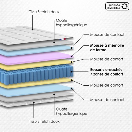 Pour un repos véritablement réparateur, le matelas intègre 7 zones de confort différenciées. Ce découpage anatomique permet un soutien millimétré de la tête aux pieds, soulageant spécifiquement les points de pression au niveau des épaules, des lombaires et du bassin. Nos tissus sont certifiés oeko-tex.