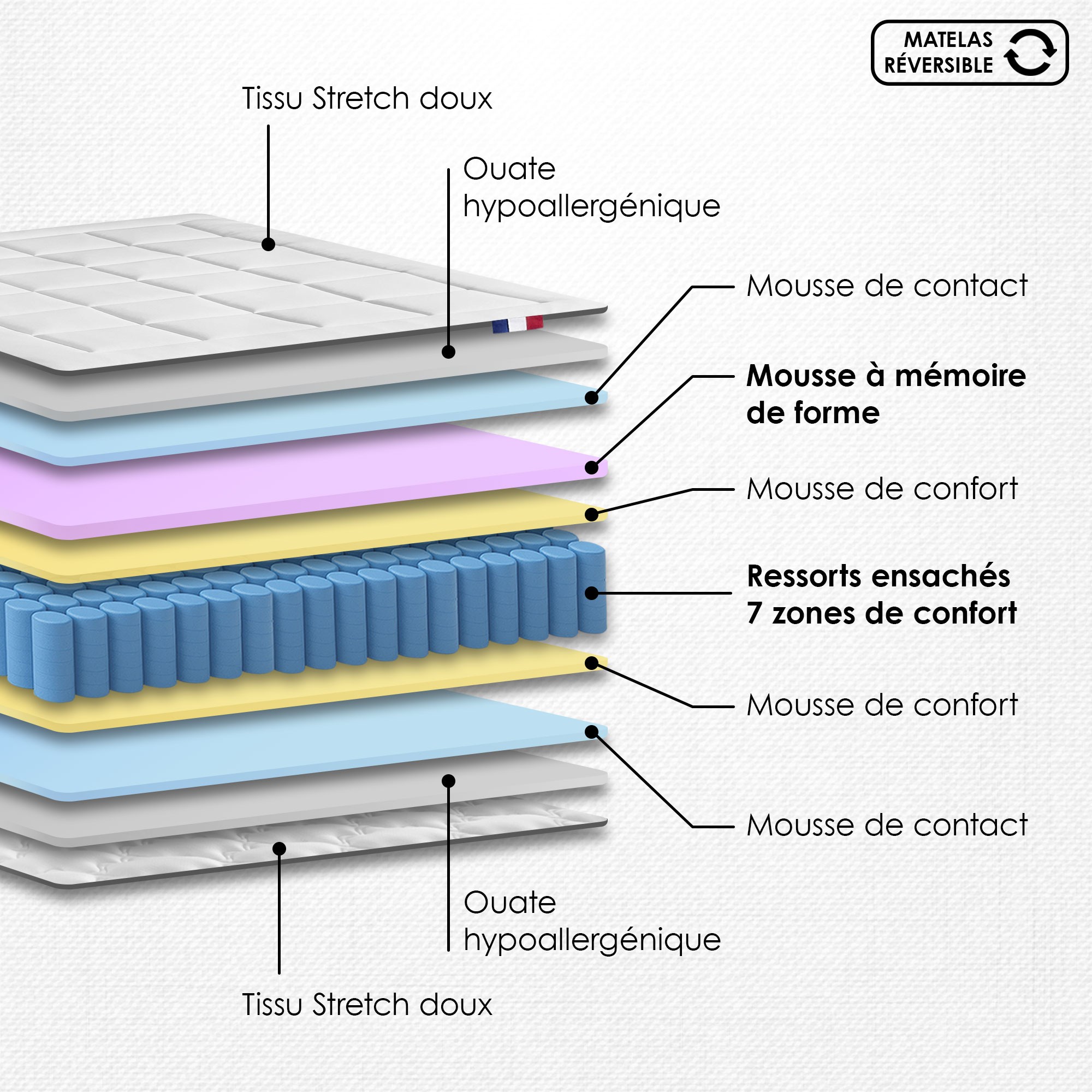 Le matelas Hygge associe soutien ferme et accueil moelleux, avec 7 zones de confort et une double face été/hiver.