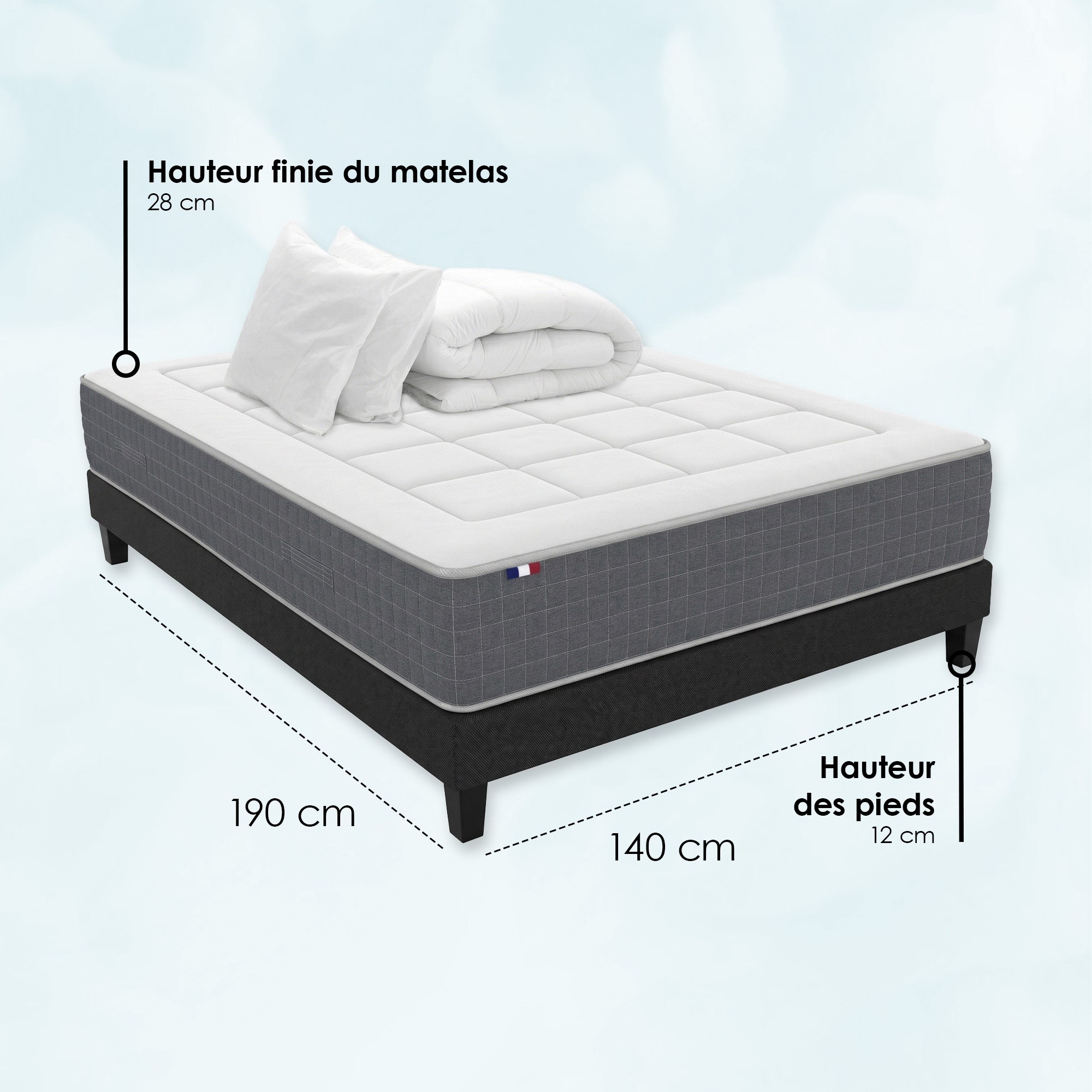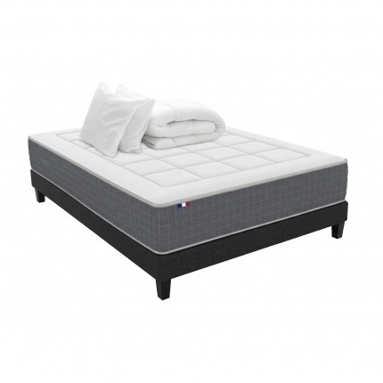 Cet ensemble literie fabriqué en France associe un matelas ressorts ensachés 7 zones, un sommier déco robuste et un pack couette et oreillers pour un confort optimal toute l’année.