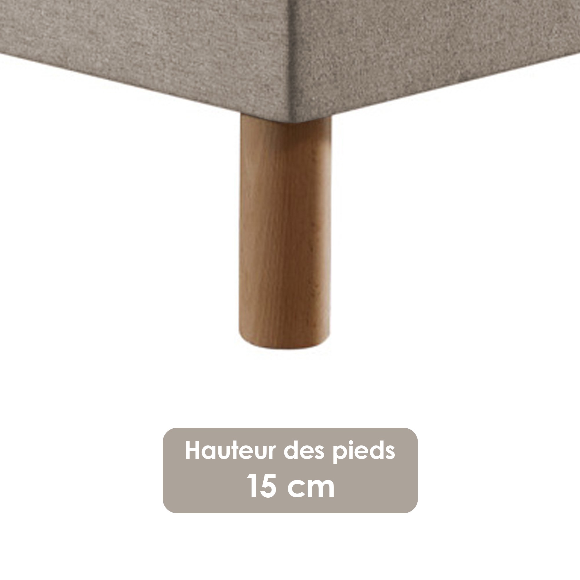 Chaque sommier est conçu avec une caisse en bois de 16 cm de hauteur, recouverte d’un tissu lisse beige. La hauteur totale atteint 31 cm une fois les pieds installés. La finition beige apporte douceur et luminosité à votre chambre.