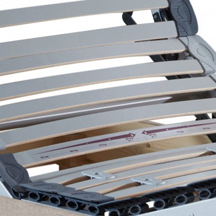 Les 29 lattes multiplis par sommier, avec embouts de suspension, assurent un excellent maintien du dos et une bonne indépendance de couchage. 6 lattes sont réglables via curseurs de fermeté pour un soutien lombaire personnalisé.
