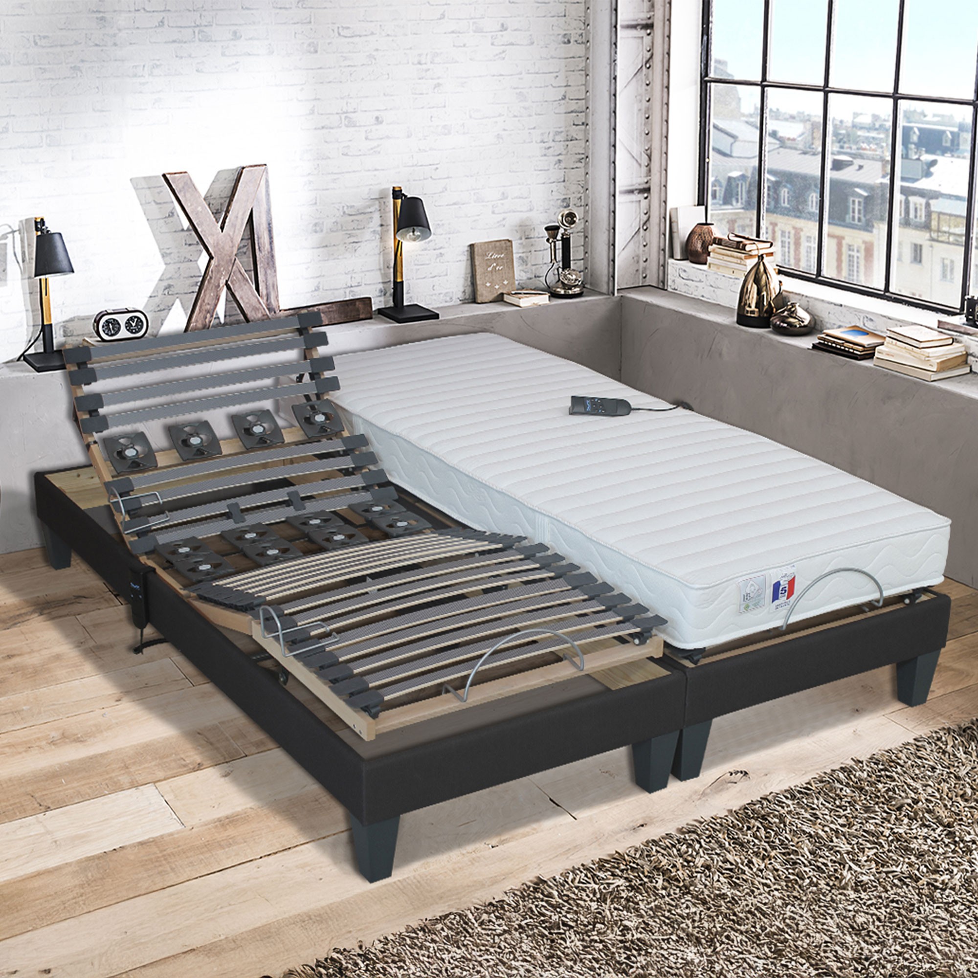 Ce sommier électrique à 5 plis, robuste et personnalisable, offre un confort optimal grâce à ses lattes réglables et son design moderne en tissu gris anthracite.