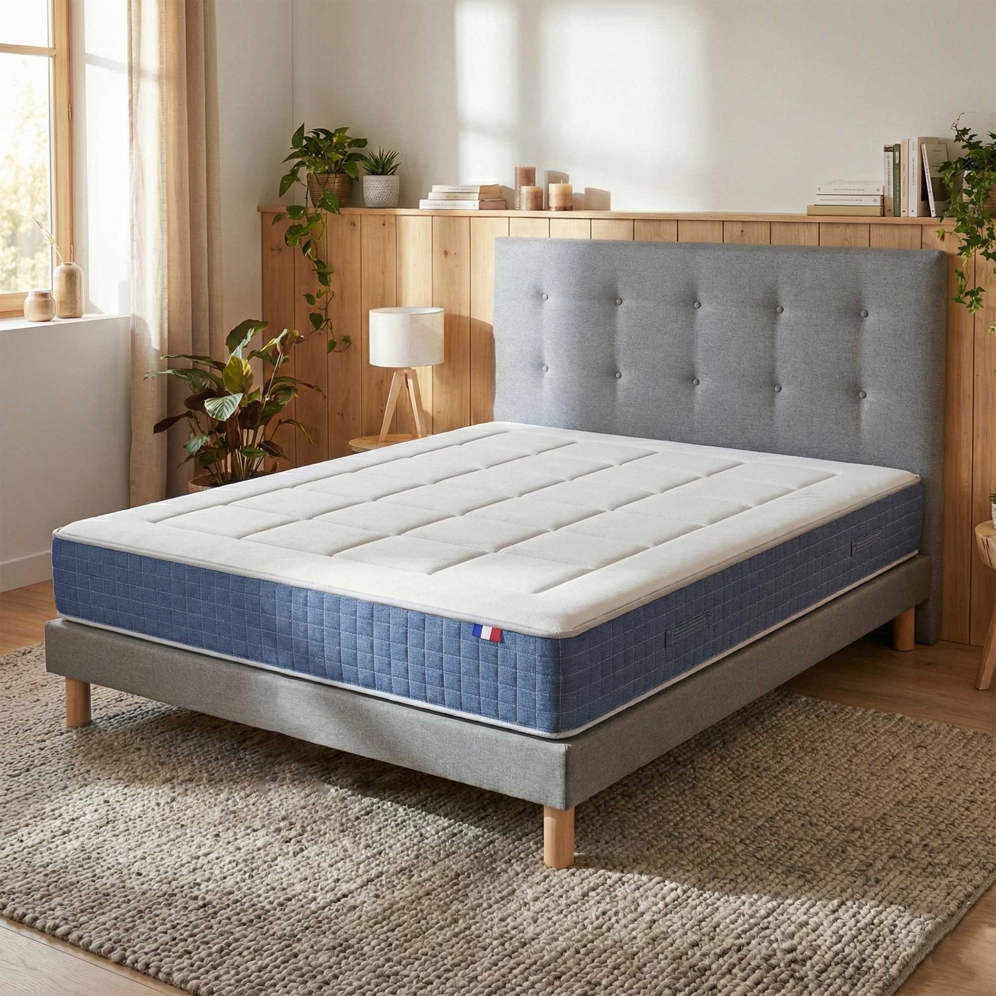 Ensemble matelas ressort, H28 cm, accueil memoire de forme, sommier et tete de lit gris