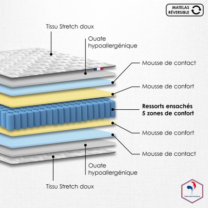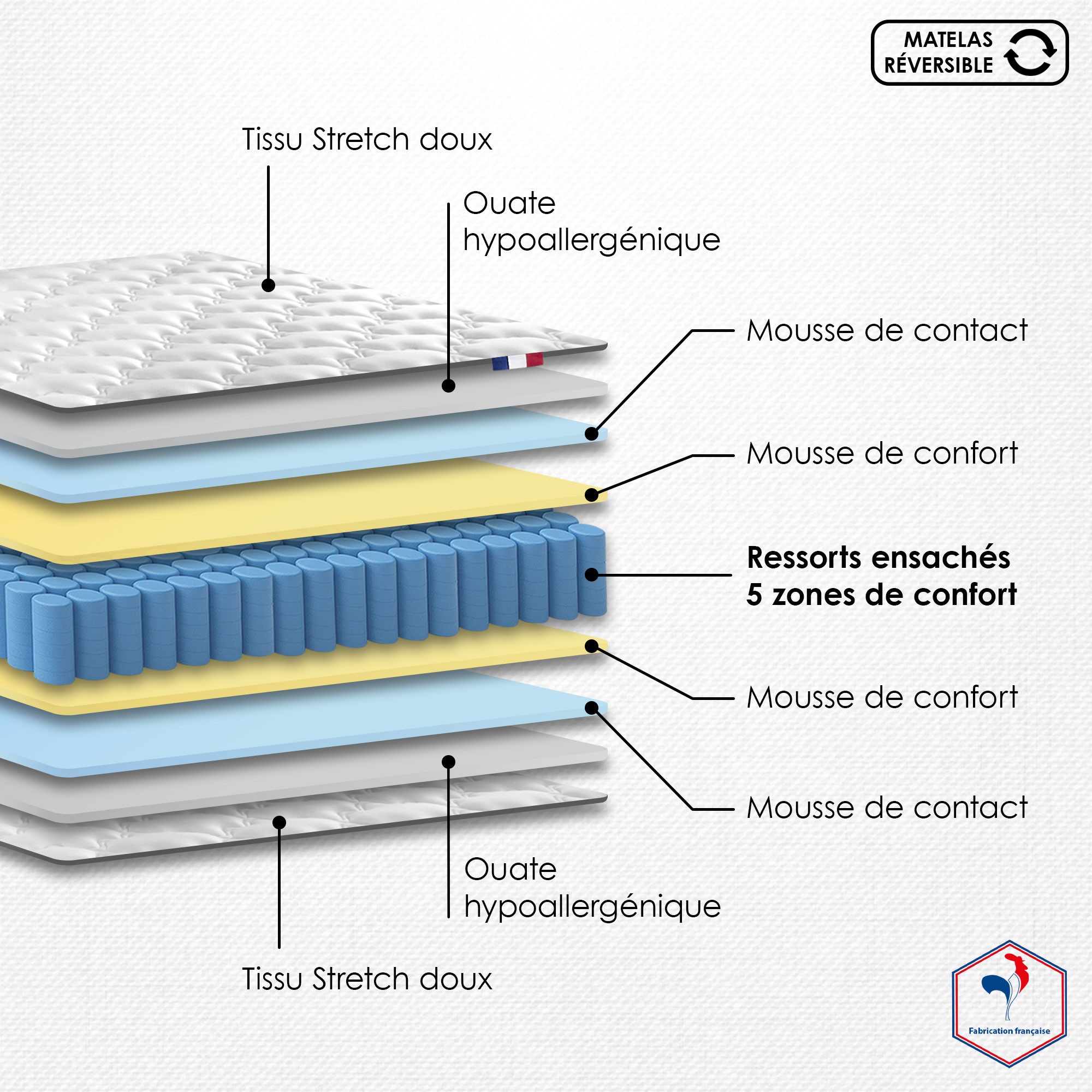 5 zones de couchage différenciés de fermeté pour une réelle ergonomie : Tête / Epaules / Lombaire / Jambes / Pieds